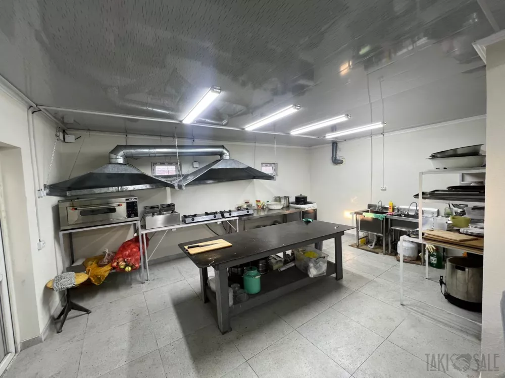 - Производственная кухня: несколько рабочих зон, большие столы для разделки, открытые стеллажи для посуды и инвентаря, мойка, микроволновая печь, холодильное