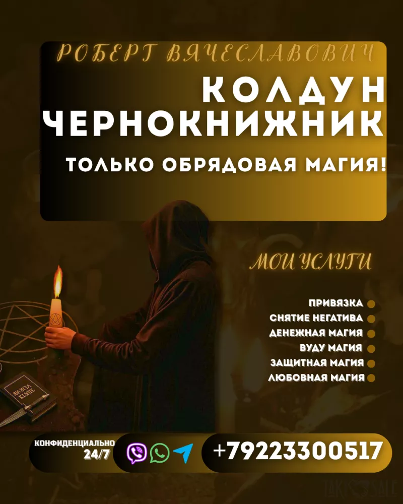 Колдун, Чернокнижник Роберт Вячеславович – Магия с 18-летним Стажем. Результат Гарантирован!    Приветствую! Устали от пустых обещаний гадалок? Я, Роберт Вячеславович, потомственный колдун и чернокнижник с 18-летним опытом, предлагаю реальную помощь в решении самых сложных жизненных ситуаций с помощью обрядовой магии.     Мои услуги:   Любовная магия: Привороты, отвороты, гармонизация отношений, возвращение любимых.Денежная магия: Привлечение удачи в бизнесе, устранение финансовых проблем, обряды на богатство.Магия Вуду: Мощные ритуалы для достижения желаемого, подчинение воли, наказание обидчиков.Снятие негатива: Избавление от сглаза, порчи, проклятий, очищение ауры.   Почему выбирают меня:   Опыт: 18 лет практики в обрядовой магии.Гарантия результата: Видимые изменения уже через 14-20 дней.Честные условия: Бесплатная диагностика, фиксированная цена, частичный возврат средств при отсутствии эффекта.Конфиденциальность: Ваши секреты под надежной защитой.Индивидуальный подход: Работаю только с проверенными и эффективными ритуалами, подбирая их под конкретную ситуацию.   Не ведаю, а знаю! Мои обряды – это не сказки, а реальная работа с энергиями. Обращайтесь, и я помогу вам обрести счастье, любовь и процветание! Работаю по всему миру! Решили изменить свою судьбу? Не откладывайте на завтра то, что можно сделать сегодня! Запишитесь на бесплатную диагностику, и я расскажу, как магия может помочь именно в вашей ситуации. Мы вместе определим корень проблемы и подберем наиболее действенный обряд для ее решения. Я не берусь за все подряд, а работаю только с теми случаями, где вижу реальную возможность помочь. Многие мои клиенты уже смогли построить счастливые отношения, наладить финансовое положение и избавиться от негативного воздействия. Их истории успеха – лучшее доказательство моей компетенции. Я горжусь тем, что могу дарить людям надежду и возвращать им контроль над своей жизнью. Не бойтесь довериться силе магии, когда кажется, что все остальное бессильно. Помните, что обращение к магу – это серьезный шаг, который требует осознанного подхода. Я не буду говорить вам то, что вы хотите услышать, а честно оценю ситуацию и предложу реальные пути решения. Моя цель – не обогащение, а помощь тем, кто действительно в ней нуждается. Свяжитесь со мной прямо сейчас, и мы обсудим вашу проблему. Я отвечу на все ваши вопросы и развею ваши сомнения. Уверены ли вы, что готовы изменить свою жизнь к лучшему? Тогда я жду вашего звонка или сообщения. Верьте в магию, и она обязательно поможет вам!   МОИ КОНТАКТЫ: +79223300517 Whatsapp, Telegramm, Viber