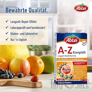 Abtei – Abbey A-Z Complete Depot Long-Term Multivitamins Support your overall health and daily nutrition with Abbey A-Z Complete Depot, a comprehensive multivitamin formula designed for long-term use. It provides essential vitamins and minerals to help maintain energy, immunity, and general well-being.