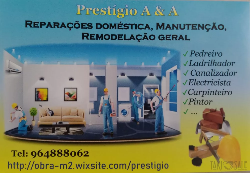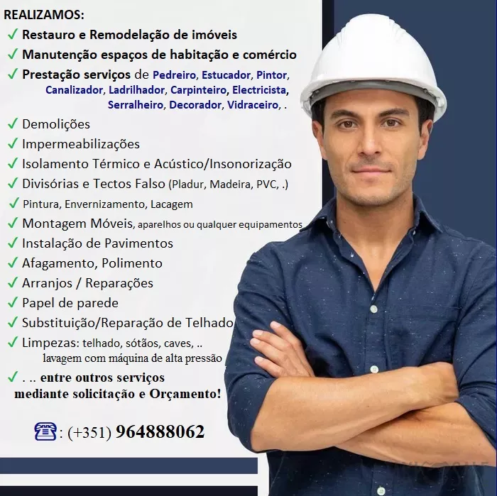 Prestação uma vasta gama de serviços com profissionalismo e responsabilidades, desde substituir uma lampada até efectuar uma Remodelação total de apartamentos, casas antiga, vivendas, moradias, lojas,  . ..  Manutenção espaços de habitação e comercio.
