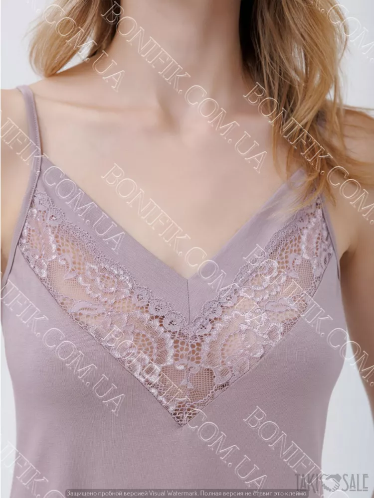 Представлена на тонкій бретелі, зона декольте декорована мереживною вставкою. Матеріал міцний, не розтягується.