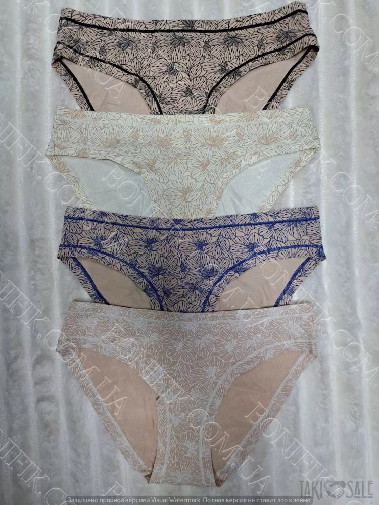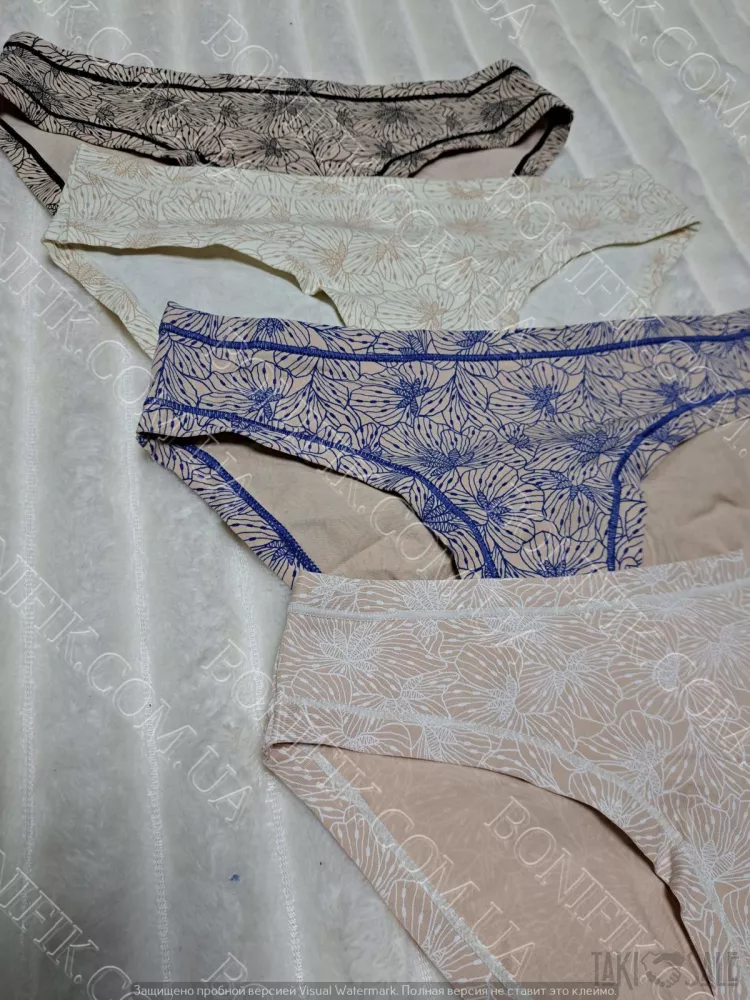 Комплект трусів-сліп складається із 4 кольорів з абстрактним малюнком. Виготовлені із бавовни з еластановою ниткою для збільшення розтяжності.