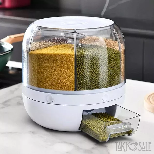 Прозрачный вращающийся диспенсер для сыпучих продуктов с дозатором – отличное решение для хранения различных круп, кофе, сухих завтраков и др. Сохраняет продукты сухими и свежими и отлично организует пространство. Вращающийся контейнер для продуктов можно поставить в угол стены и компактно организовать до 5 кг круп.