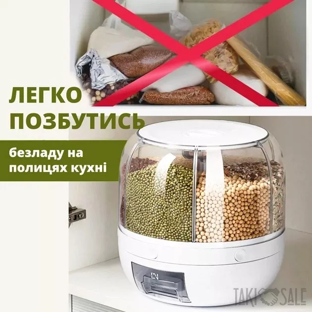ВРАЩАЕТСЯ НА 360. Контейнер для круп, легко и без усилий вращается на 360 градусов, что поможет вам в удобстве пользования крупами.