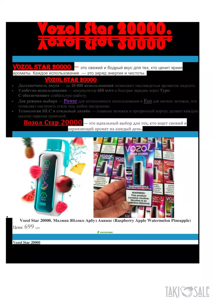 VOZOL STAR 20000 — это свежий и бодрый вкус для тех, кто ценит яркие ароматы. Каждое использование — это заряд энергии и чистоты. Преимущества VOZOL STAR 20000 Долговечность вкуса — до 20 000 использований позволяют наслаждаться ароматом надолго.