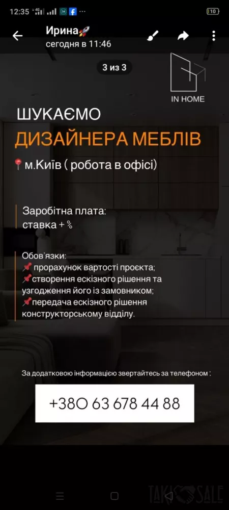 ШукаємоДизайнера корпусних меблівддМісце роботи КиївЗаробітна плата : ставка + %Обовʼязки:- спілкування з замовником ;- створення ескізного рішення та узгодження його із замовником;- прорахунок вартості проєкту;- передача ескізного рішення конструкторському відділу- прорахунок вартості проєкту;За детальною інформацією звертайтеся в телеграм або телефонуйте38 (063) 678 44 88
