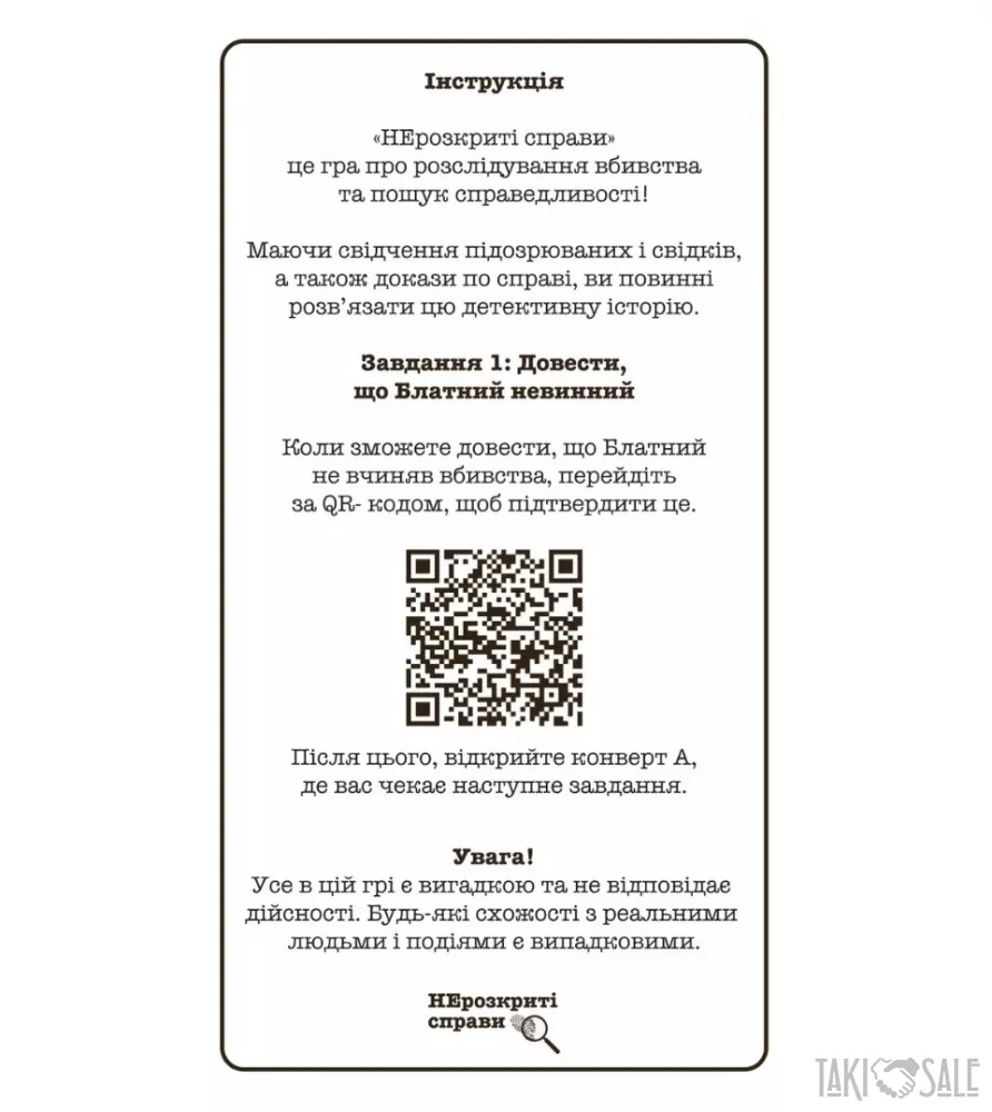 Детективна гра-квест для 2-8 гравців, які на кілька годин перетворяться на справжніх детективів і спробують розкрити вбивство, що сталося в Києві на початку 90-х.