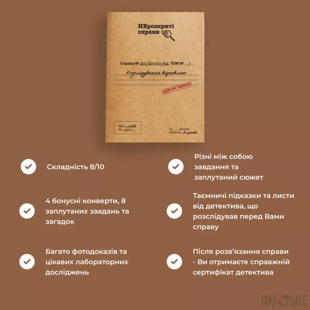Детективна гра-квест для 2-8 гравців, які на кілька годин перетворяться на справжніх детективів і вирушать до Львова - спробуйте розкрити загадкову смерть, яка сталася 2004 року в одному зі спальних районів міста.