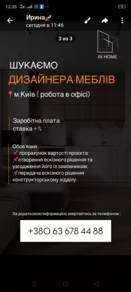 Менеджер-дизайнер, менеджер з продажу меблів , дизайнер-консультант меблів. IN HOME — це меблева компанія, створена щасливою сім’єю для таких самих подружніх пар. Ми віримо, що меблі та інтер’єр — це відображення способу життя людини. Саме тому ми робимо акцент на якості, ексклюзивності та затишку. Наша головна мета — створити простір спокою й комфорту та зробити процес меблювання легким і приємним для наших клієнтів. Кожен інтер’єр унікальний і несе в собі характер власників — ми цінуємо цю індивідуальність. У нашій команді панує дружня та підтримуюча атмосфера. Ми віримо, що лише в таких умовах можна створювати по-справжньому якісний і красивий продукт. Взаємоповага, допомога й залученість кожного — наші ключові цінності. І зараз ми шукаємо у команду дизайнера меблів, який поділяє наші цінності й любов до справи ❤️ Що входитиме у твої обов’язки: • Виїзди на об’єкти для узгодження дизайну та підбору матеріалів • Розробка дизайн-проєктів меблів на замовлення (Pro100, SketchUp, ArchiCad) • Розрахунок вартості виготовлення меблів • Підготовка договорів та технічної документації для виробництва • Координація з іншими відділами компанії (виробництво, відділ продажів тощо) • Повний супровід замовника — від знайомства до здачі об'єкта Що ми очікуємо від тебе: • Досвід роботи у меблевій сфері, зокрема проєктуванняна замовлення • Впевнене володіння програмами для 3D-моделювання (особливо SketchUp) • Досвід оформлення технічної документації та договорів • Знання матеріалів і технологій у меблевому виробництві • Креативність, вміння працювати в команді • Клієнтоорієнтованість та високі комунікаційні навички Що ми пропонуємо: • Конкурентну зарплату та бонуси за результатами роботи • Гібридний формат: дистанційна робота + виїзди на об’єкти • Участь у цікавих і різноманітних проєктах • Команду професіоналів, у якої можна вчитися • Навчання та можливість розвитку всередині компанії • Дружню, відкриту й надихаючу атмосферу Якщо ти хочеш створювати красиві та зручні оселі разом із нами, — тоді чекаємо на твоє резюме та портфоліо! Контакти для зв’язку: 380636784488 Також підписуйся на нас у соцмережах: @mebli_inhome— щоб відчути наш стиль і натхнення .