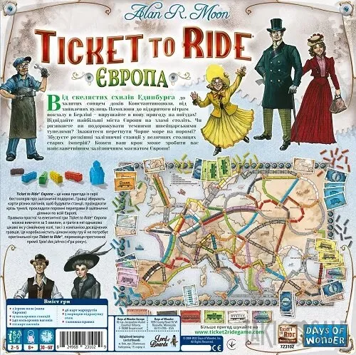 українська локалізація гри Ticket to Ride Europe, яка продовжує серію захоплюючих сімейних стратегій на залізничну тематику і вважається однією з найкращих сімейних стратегій – прості правила, захоплюючий ігровий процес та чудове, лампове, оформлення протягом багатьох років виводять гру в топи продажів по всьому світу.