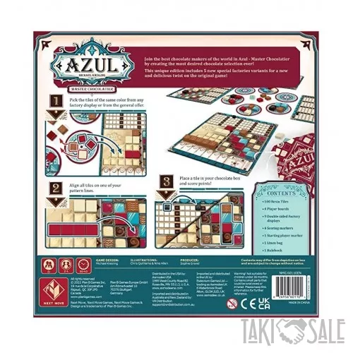 Красива абстрактна сімейна стратегія, колекційне видання популярної абстрактної гри Azu, в якій гравці стануть майстрами шоколатьє і змагатимуться у створенні найгарніших шоколадних наборів! Правила залишилися такими ж, як у класичній грі Azul, однак, крім нового дизайну, у гру вводяться спеціальні блюдця, ефекти яких впливатимуть або на підготовку до раунду, або на раунд цілком.