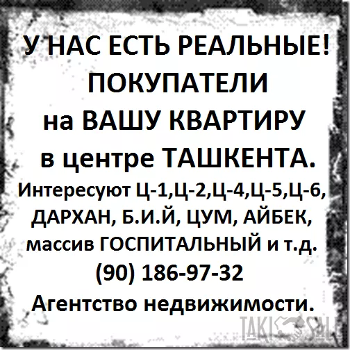 Ищем в покупку 1-2х-3х-4х... комнатные квартиры на Ц-1, Ц-2, Ц-4, Ц-5, Ц-6, Дархан, М. Горького, ЦУМ, Айбек, массив Госпитальный и в других центральных районах Ташкента. Интересует как и вторичка, так и Новостройки.