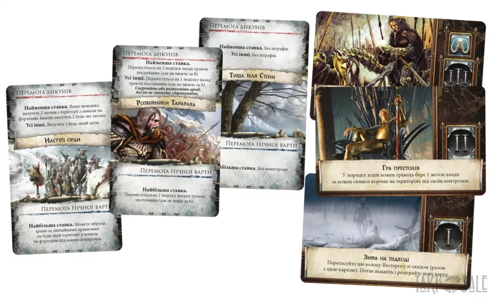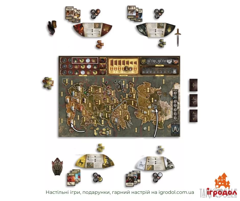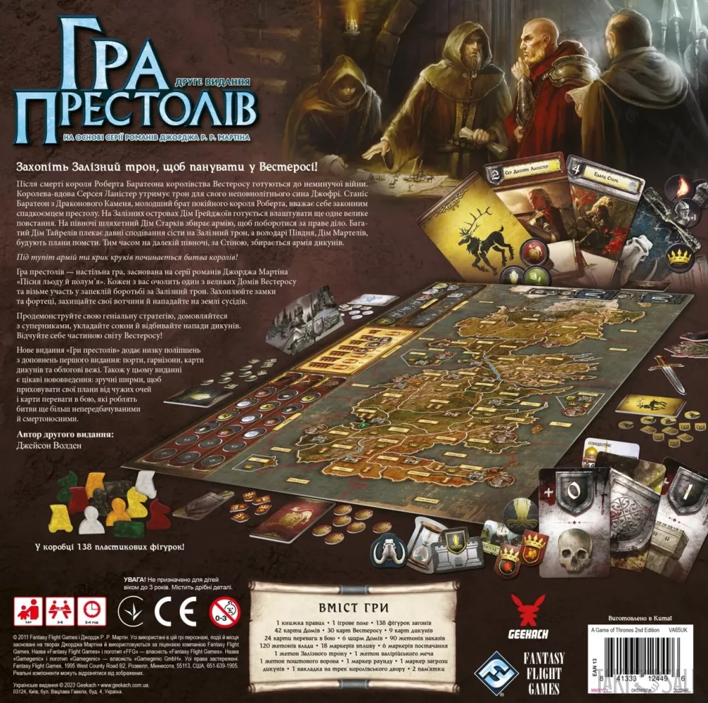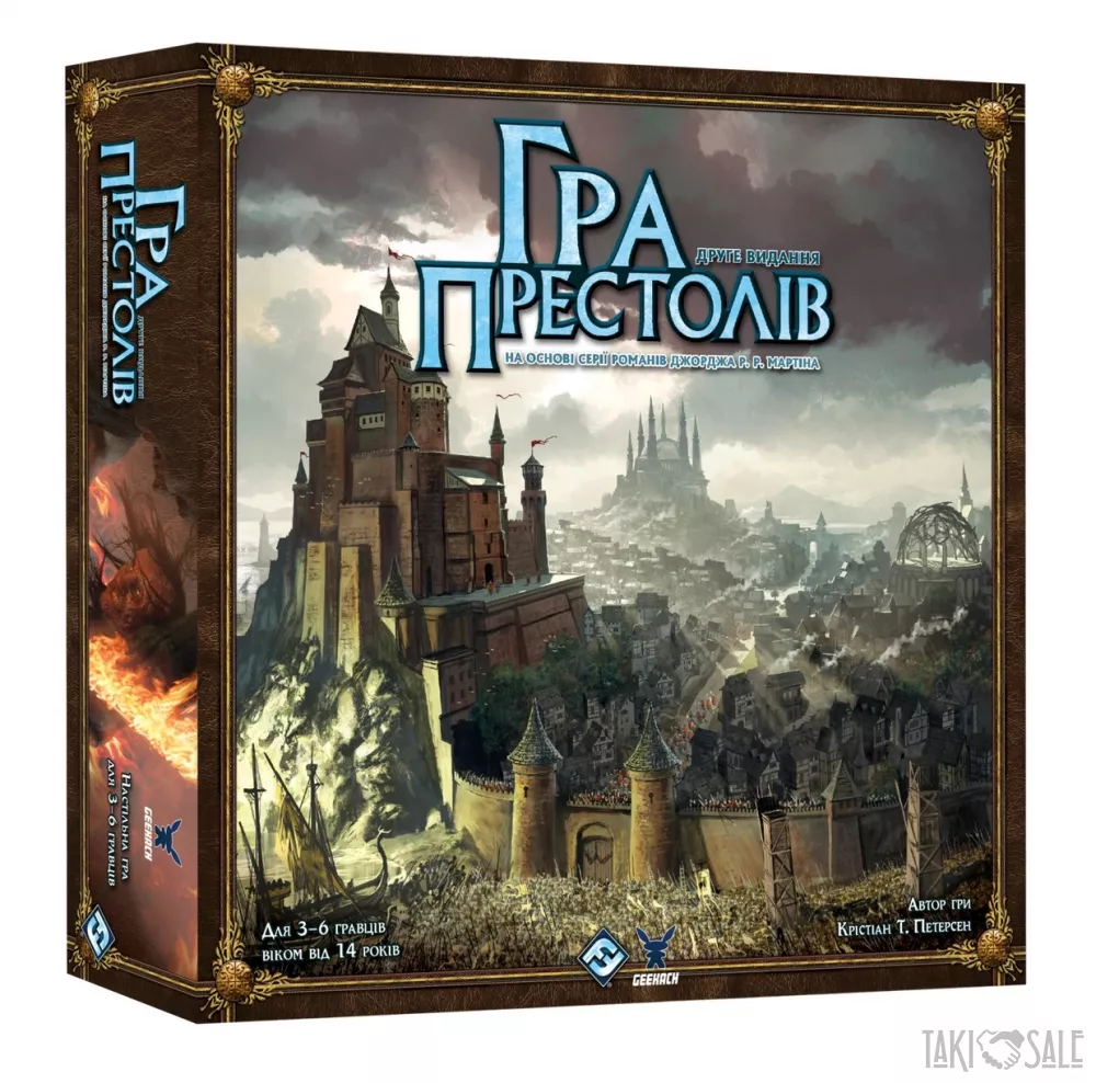 Легендарна воєнно-економічна стратегія за циклом романів Дж. Мартіна Пісня Льоду і Полум'я. українська локалізація настільної гри A Game of Thrones: The Board Game Second Edition, в якій великі доми Вестероса зійдуться в битві за залізний трон! Це епічна стратегія для 3-6 гравців, у якій на вас чекають великі битви та витончені інтриги!