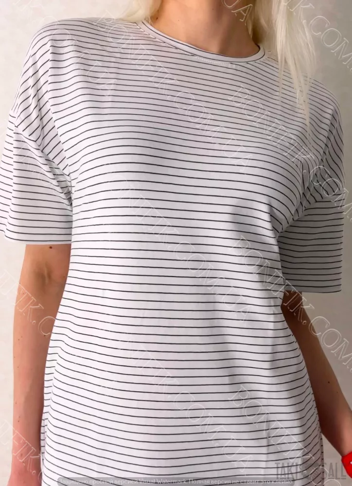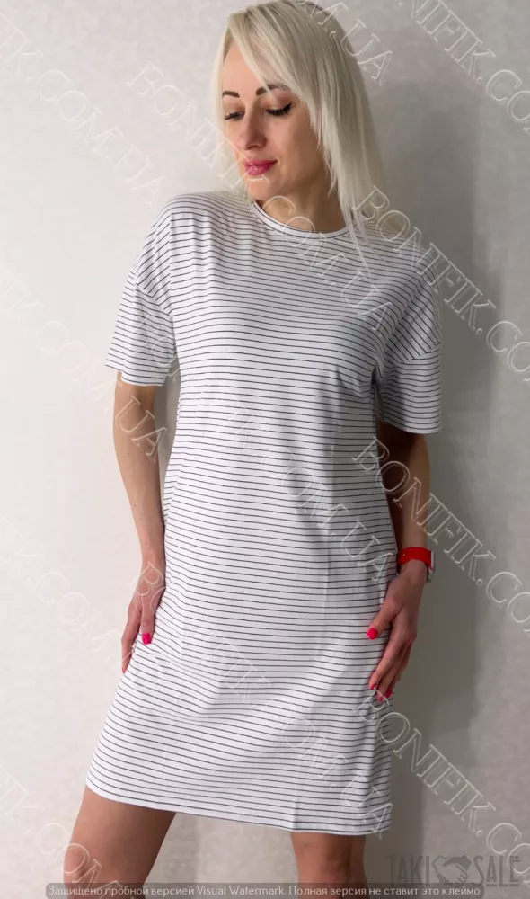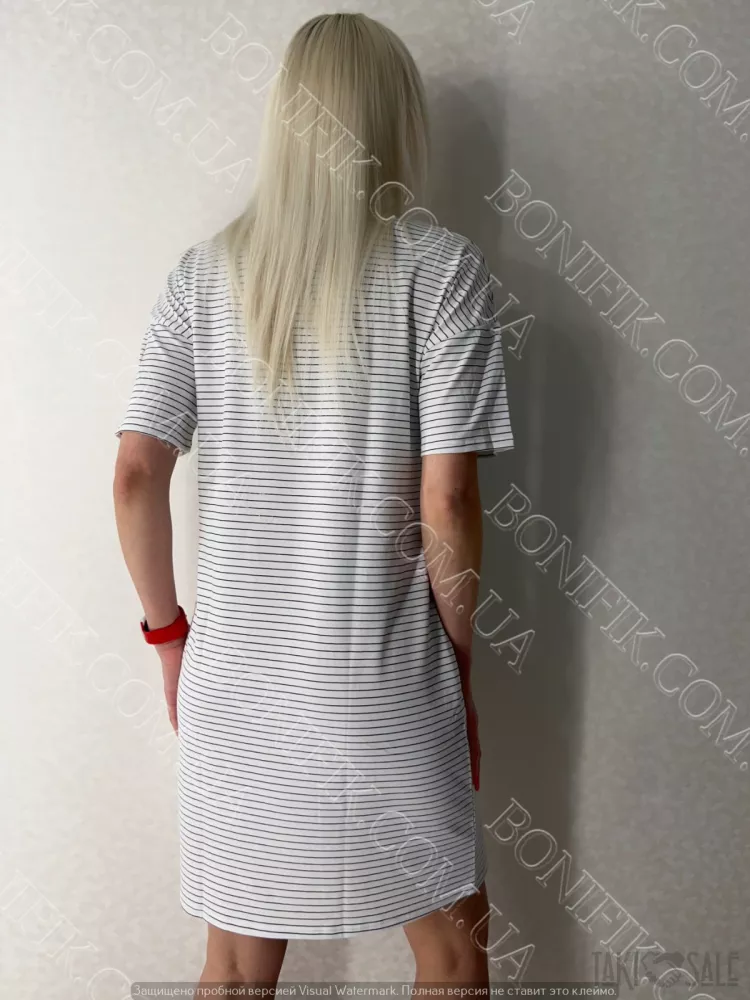 Модель домашньої сукні виконана в білому кольорі, має вільний силует, довжиною вище колін, з коротким рукавом. По всій довжині сукні доданий принт «смужка».