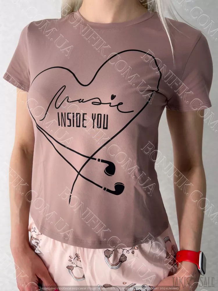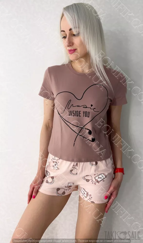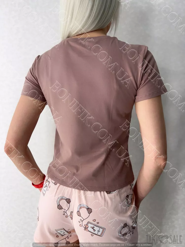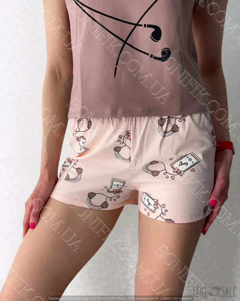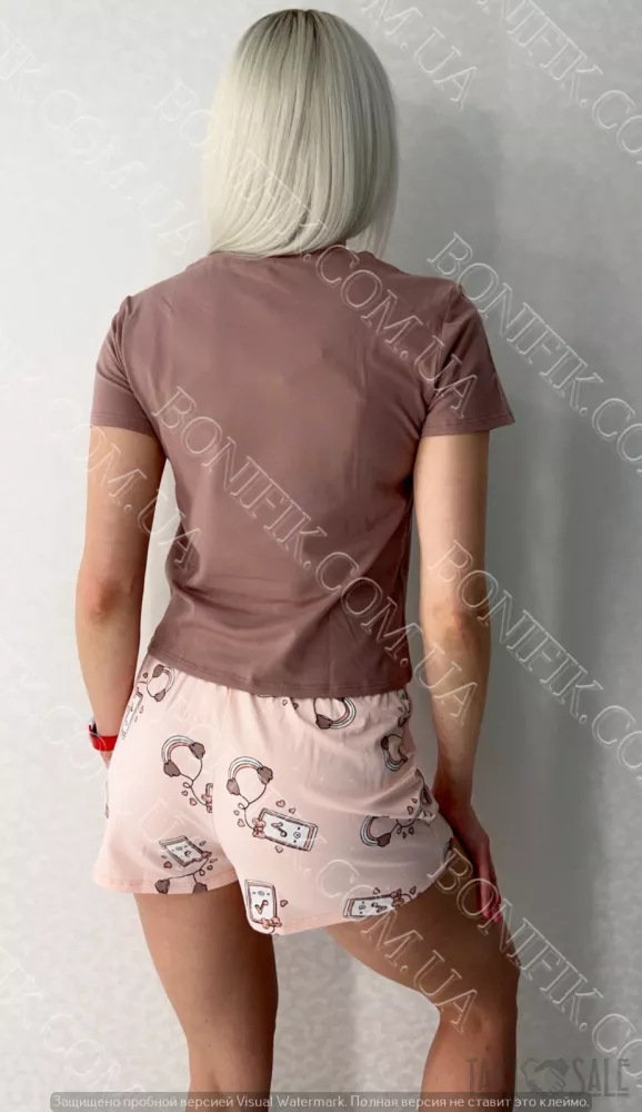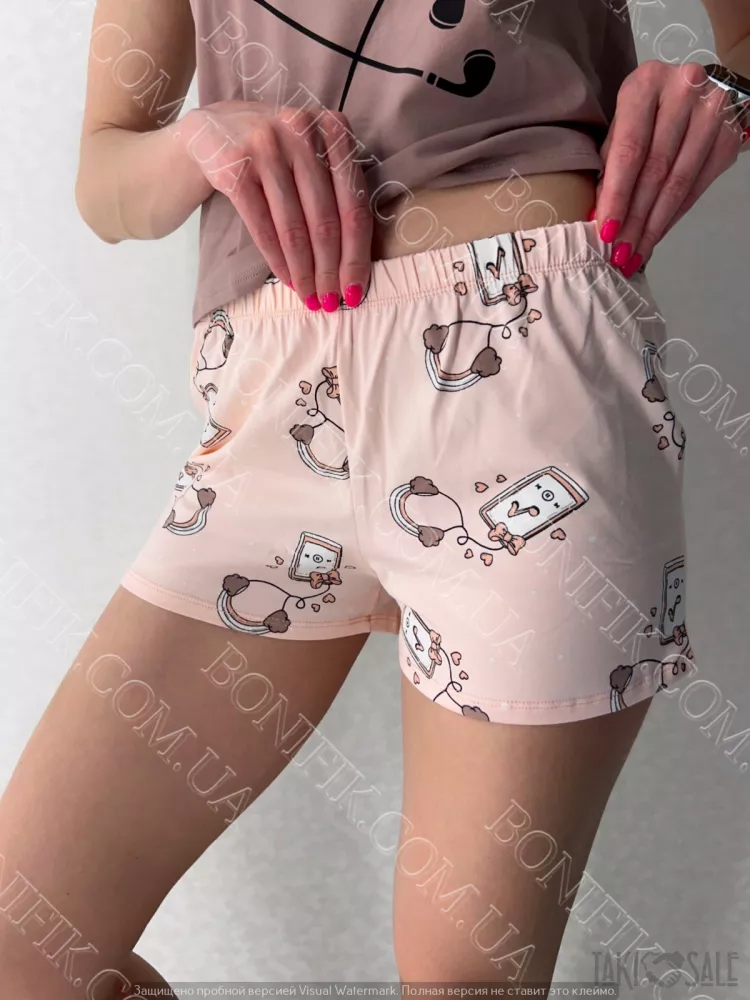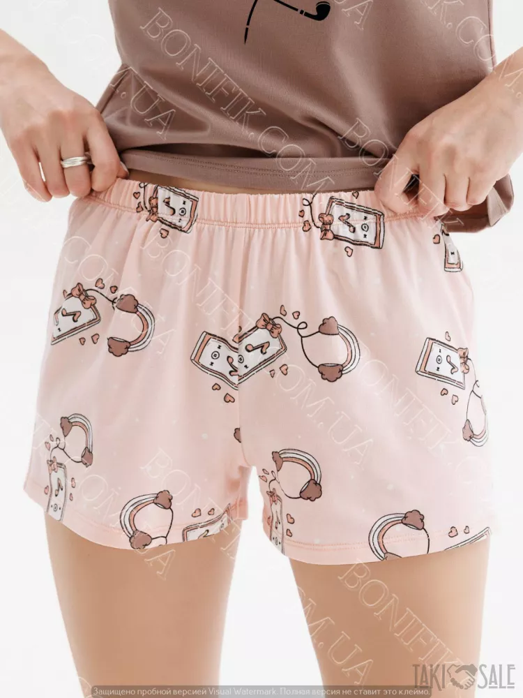 Піжама складається із футболки і шорт вільного силуету. Наголос моделі піжами зроблений на привабливих малюнках на футболці та шортиках.