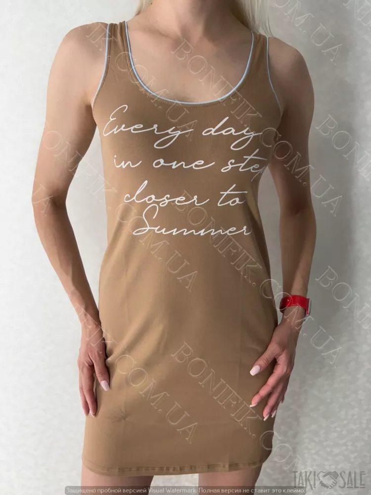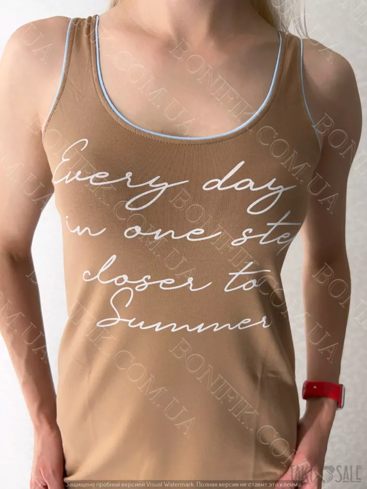Оригінальний білий напис «Every day I'm one step closer to Summer» надає образу легкості та надихаючий настрій.