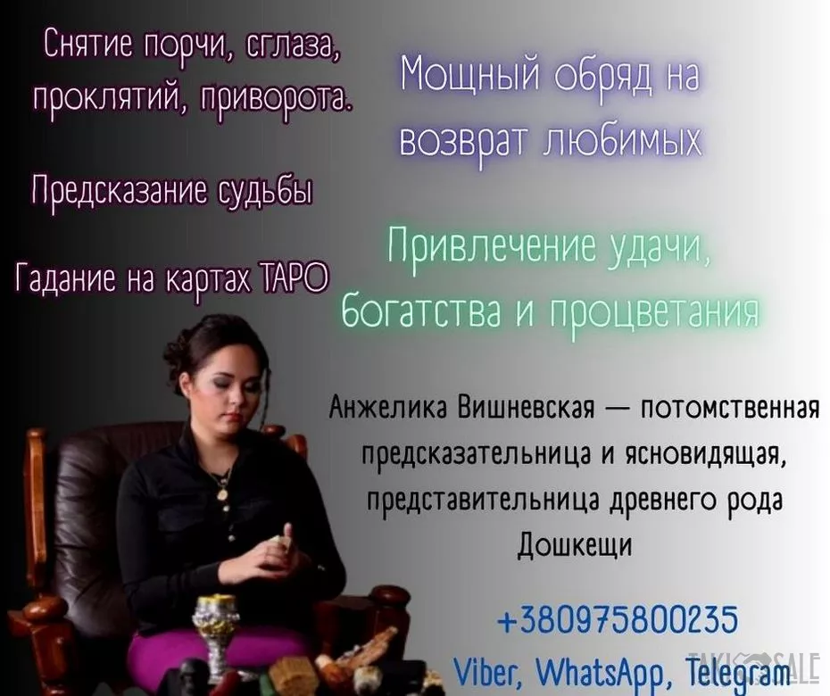 Анжелика Вишневская — потомственная ясновидящая и предсказательница из рода Дошкещи, где магические знания передаются по женской линии. Многолетняя практика и природный дар позволяют ей эффективно помогать людям в сложных жизненных ситуациях. Работа основывается на безопасности, личной этике и точности.