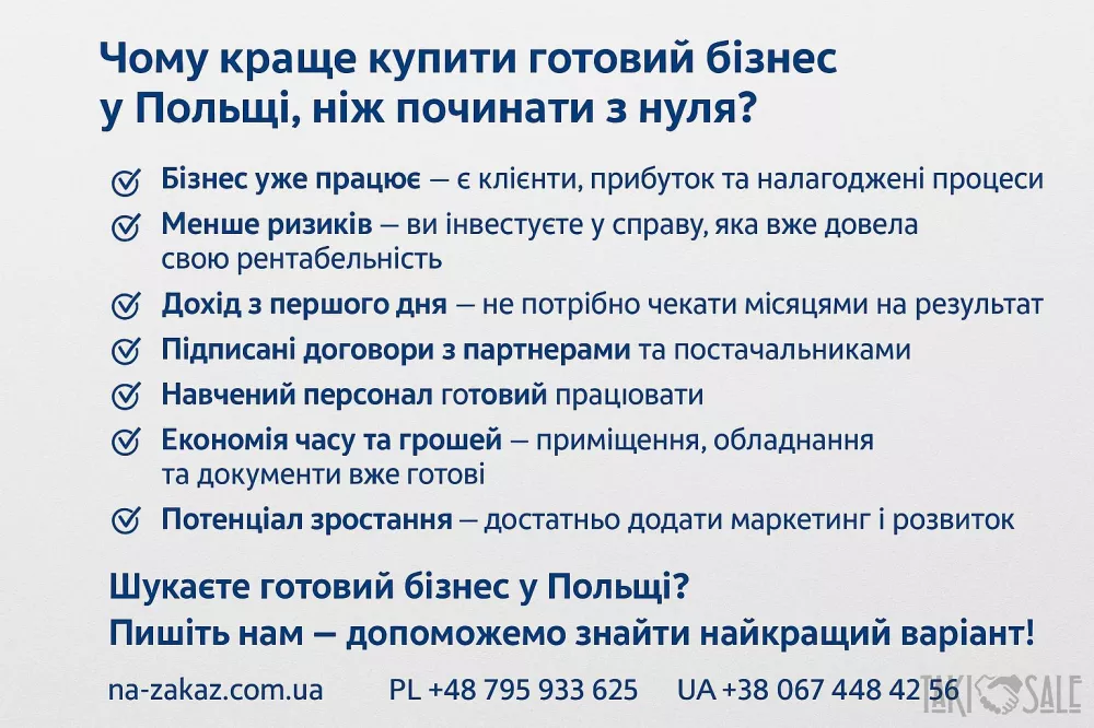 Чому краще купити готовий бізнес у Польщі, ніж починати з нуля?- Бізнес уже працює – є клієнти, прибуток та налагоджені процеси.- Менше ризиків – ви інвестуєте у справу, яка вже довела свою рентабельність.- Дохід з першого дня – не потрібно чекати місяцями на результат.- Підписані договори з партнерами та постачальниками.- Навчений персонал готовий працювати.- Економія часу та грошей – приміщення, обладнання та документи вже готові.- Потенціал зростання – достатньо додати маркетинг і розвиток.Купуючи готовий бізнес у Польщі, ви сідаєте за кермо авто, яке вже їде.А відкриваючи бізнес з нуля – вам доведеться будувати його самостійно і сподіватися, що він поїде.Шукаєте готовий бізнес у Польщі? Пишіть – допоможемо знайти найкращий варіант! Сайт: na-zakaz.com.ua