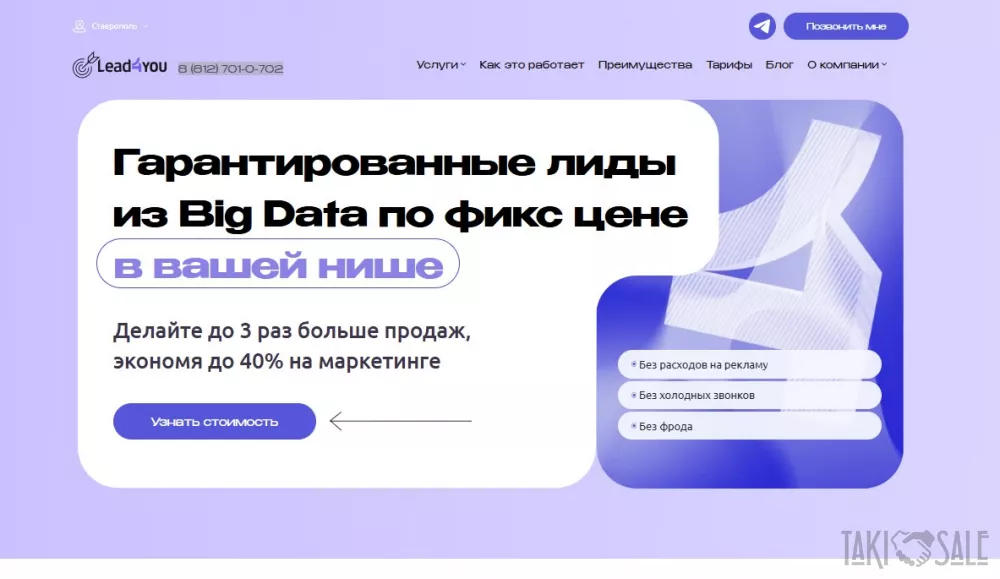 Сервис Lead4You помогает бизнесу получать стабильный поток тёплых заявок без затрат на рекламу, холодные звонки и риск фрода. Мы анализируем спрос в вашей нише, собираем данные через Big Data и передаём только целевые контакты, готовые к покупке.